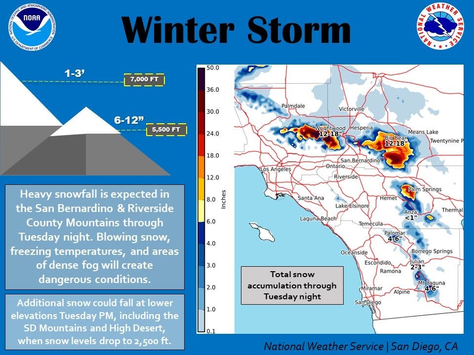 "Very heavy snow is expected to fall near the top of Mt. San Jacinto," Miller said. "Snowfall totals through Tuesday night are expected to be between six inches and a foot above 6,000 feet and between one and three feet above 7,500 feet."