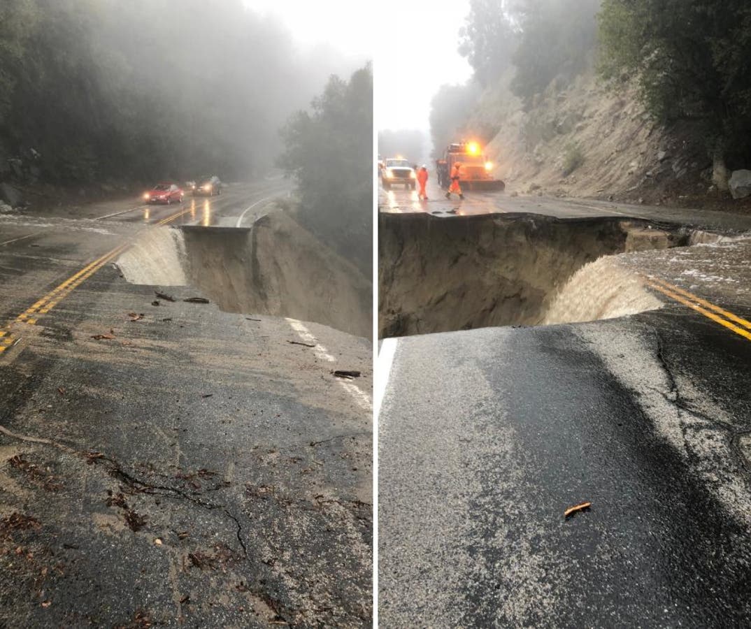 At least three sections of State Route 243 between Banning and Idyllwild were compromised because of storm runoff, Caltrans District 8 spokeswoman Terri Kasinga said. Storm runoff opened a massive sinkhole that washed away most of the pavement in one section, as pictured above.