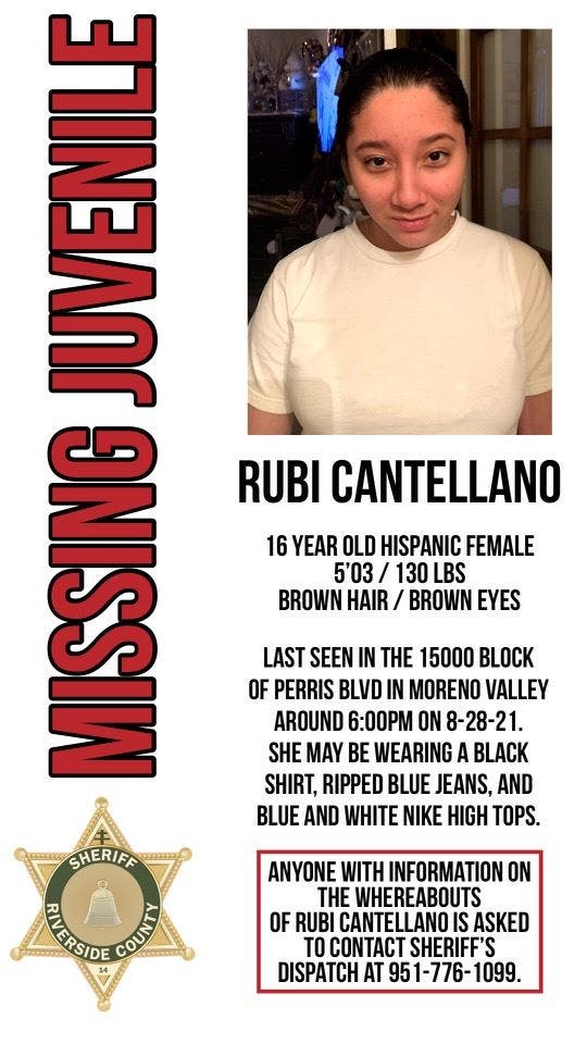 Rubi Cantellano, 16, was last seen around 6 p.m. Saturday in the 15000 block of Perris Boulevard in Moreno Valley, the sheriff's department said.