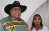 Walter Holmes, 60, and his fiancee, Candi McDonald, of the Morongo Reservation, were outside the main tent preparing for the bird singers' opening of the pow wow.