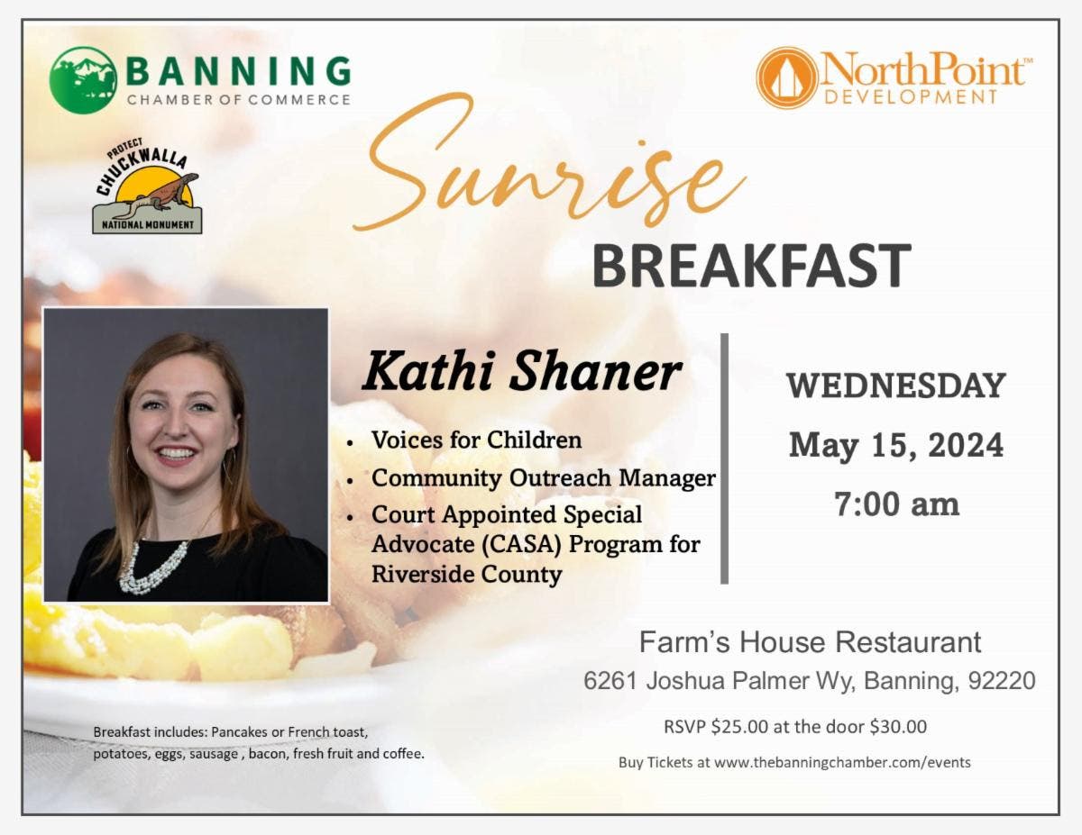 BANNING, CA—The Banning Chamber of Commerce announced its next guest speaker for its Sunrise Breakfast event: Kathi Shaner, a Court-Appointed Special Advocate (CASA) and Community Outreach Manager for Voices for Children Inc. in Riverside County.
