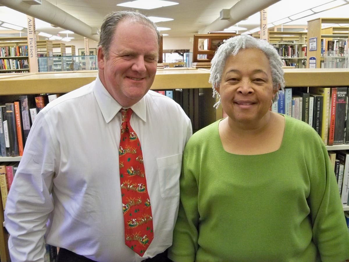 Library Volunteer Bruce Toloski and Senior Librarian Lucy Sims share a moment inside the Beaumont Library. After 11 years as a library volunteer, Toloski is moving to Orange County. The retired special agent for the U.S. Fish and Wildlife Service dedicated his life to volunteering and helping others after becoming permanently disabled while rescuing a trapped motorist. Photo by Library Director Luren Dickinson