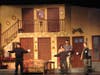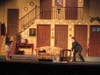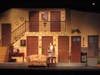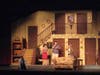 The set is made of two floors and six doors—all of which are utilized—with entrances and exits on and off stage precisely timed. Just as one character shuts one door, another character comes through another. Or breaks in through a window.