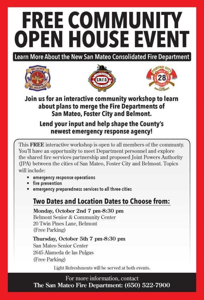 BELMONT, CA — The Belmont community is invited to participate in a workshop about the joint powers agreement (JPA) that is being considered to create the county’s newest emergency response agency by merging the Fire Departments of San Mateo, Foster City, and Belmont into the San Mateo Consolidated Fire Department.