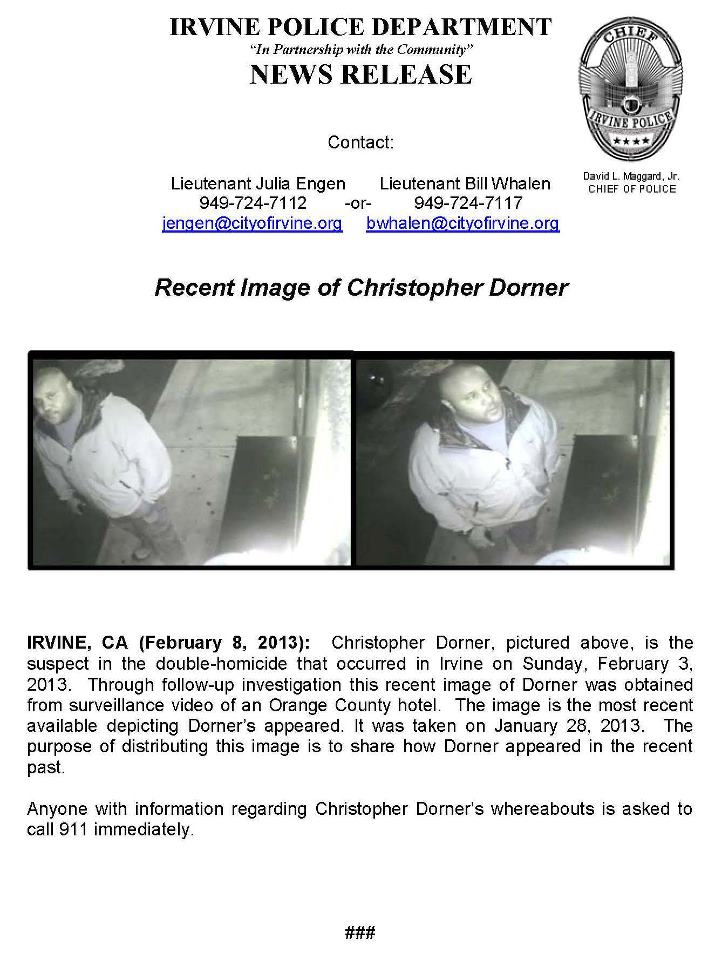 - Jan. 28: Photos of Dorner at an Orange County hotel are captured on surveillance video, still shots of which Irvine Police Department release Feb. 8, though no city is mentioned.