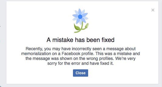 “For a brief period today, a message meant for memorialized pages was mistakenly posted to other accounts. This was a terrible error that we have now fixed. We are very sorry that this happened and we worked as quickly as possible to fix it,” a Facebook spokeswoman said in an emailed statement to Patch.
