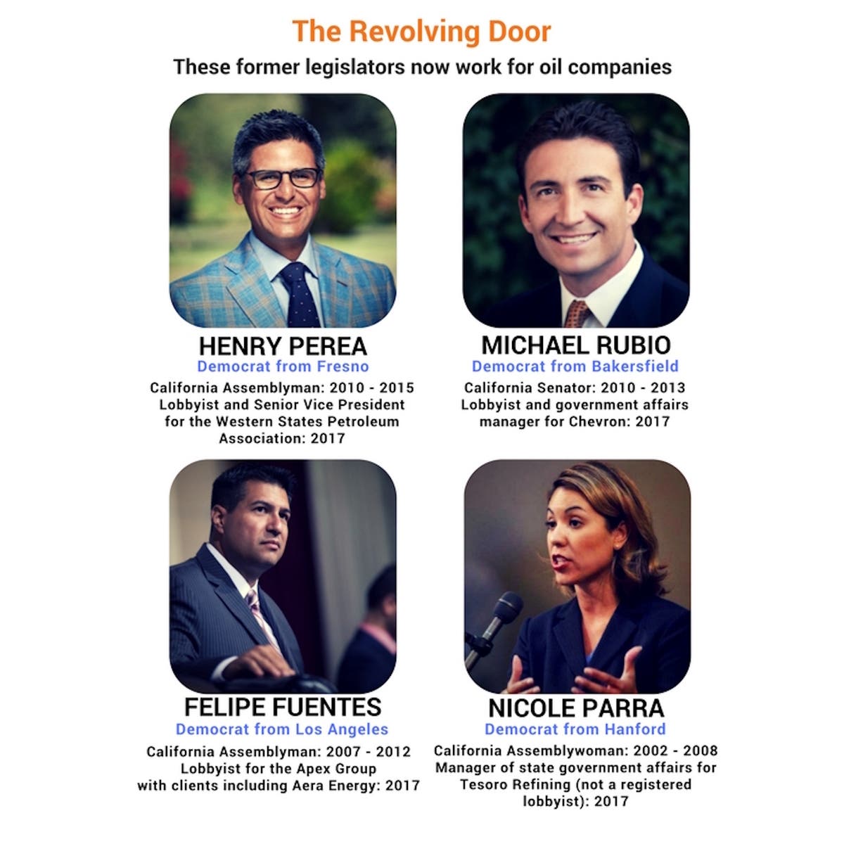 Each hailed from predominantly working class, Latino districts and joined an influential “mod squad” of moderates during their legislative tenures, which covered various periods between 2002 and 2015. Two are from Kern County, the biggest oil producer in California. And three quit their elective office mid-term to work for industry.