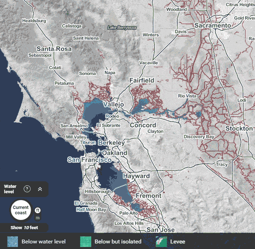 Scientists use maps such as this to help state and local officials plan for sea level rise and associated flooding. This interactive graphic shows potential flood zones with water up to 10 feet, the outer range of current projections. Check sea level rise in your neighborhood.