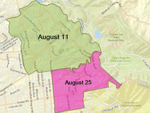 - On August 25th, 9-10am: The approximate impacted drill area will be between the borders of the Berkeley- Contra Costa County border (to the east) and Spruce Street (to the west) and Codornices Park area (to the north) and UC Berkeley campus (to the south).