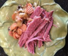 Mix mustard and horseradish together and spread over meat. Open small seasoning packet that the meat comes with that has peppercorns and spices in it. Sprinkle over meat, along with some cracked pepper. Place in baking dish or roasting pan and add water or broth. Cover with foil.
