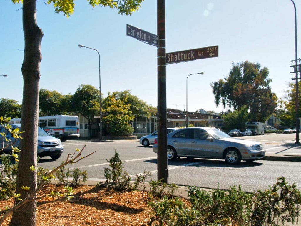 After the traffic light at Shattuck and Dwight Way, vehicles build speed and momentum. Following a curve after Carleton Street, the next traffic light is where Shattuck crosses Adeline Street at Ward Street, five blocks away from the last.