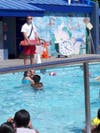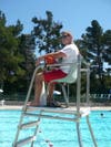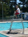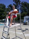 Scanning the pool from high atop his observation chair, lifeguard Nathan Bolt keeps close watch over the swimmers below, tracking their movements and ensuring their safety.
