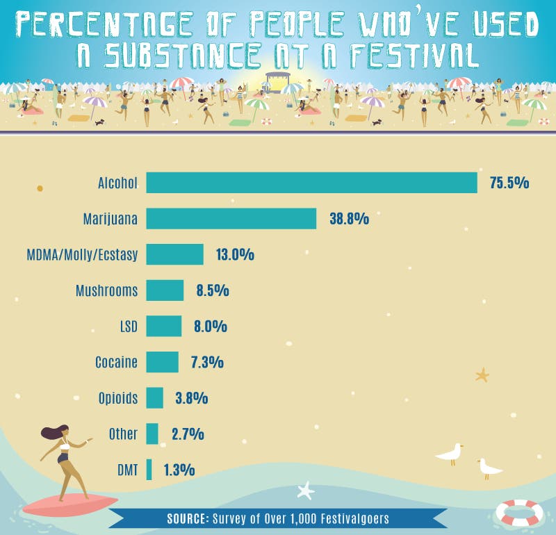 Overall, the timeless approach of drinking alcohol while grooving to the music was the most popular. Three out of four people said they've had alcohol at a festival, and 38.8 percent said they've smoked marijuana. MDMA, also known as "Molly" or Ecstasy, was used by 13 percent of festivalgoers. The less popular substances included mushrooms (8.5 percent), LSD (8 percent), cocaine (7.3 percent), opioids (3.8 percent), "other" (2.7 percent), and lastly, DMT (1.3 percent).