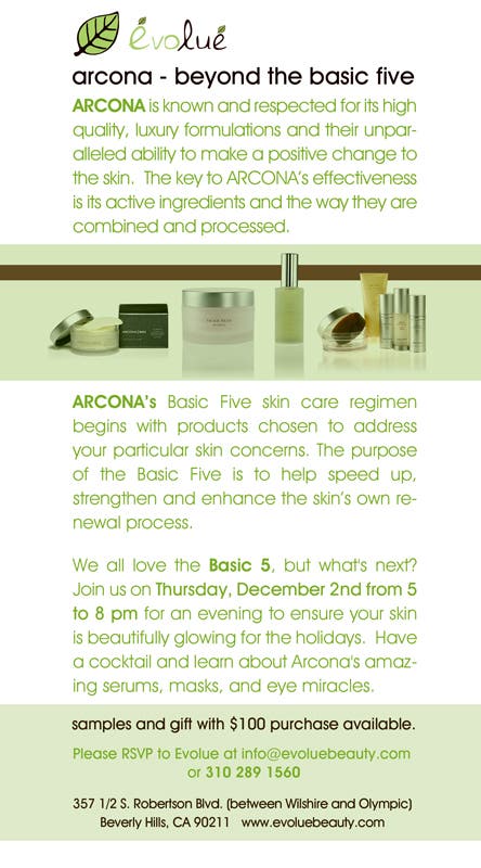 We all love the Basic 5, but what's next? Join us on Thursday, December 2nd from 5 to 8pm for an evening to ensure your skin is beautifully glowing for the holidays. Have a cocktail and learn about Arcona's amazing serums, masks, and eye miracles.
