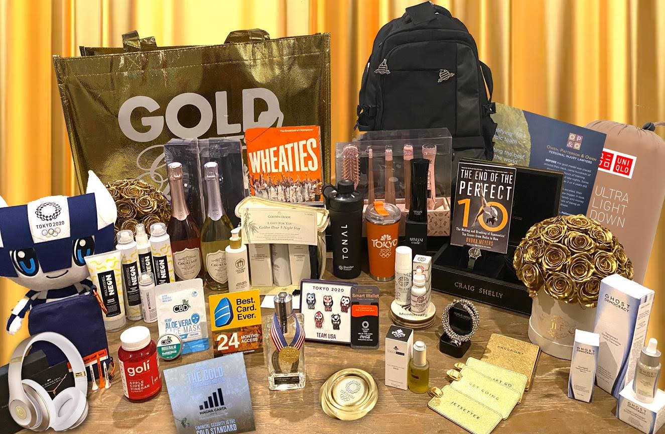 Guests of Gold Meets Golden benefit 2020 left with a jam-packed Gold-Medal Rolling Gift Bag from the Mr. Morris Foundation valued at over $10,000. Items included a Sanchaya Indonesian Resort Plush Robe and 5-night Resort Stay Coca-Cola Commemorative Toyko 2020 smartphone wallet BMW Beverly Hills mini Golf Kit, Herradura Tequila Ultra Anejo Bottle with Commemorative Gold Meets Golden Medal, Ghost Democracy Full Clean Skincare Kit, TONAL Fitness $500 coupon and Blender bottle, J'Adore Les Fleurs Everlasting Golden Flower Arrangement, UNIQLO Golden ultra-lightweight down jacket, ,