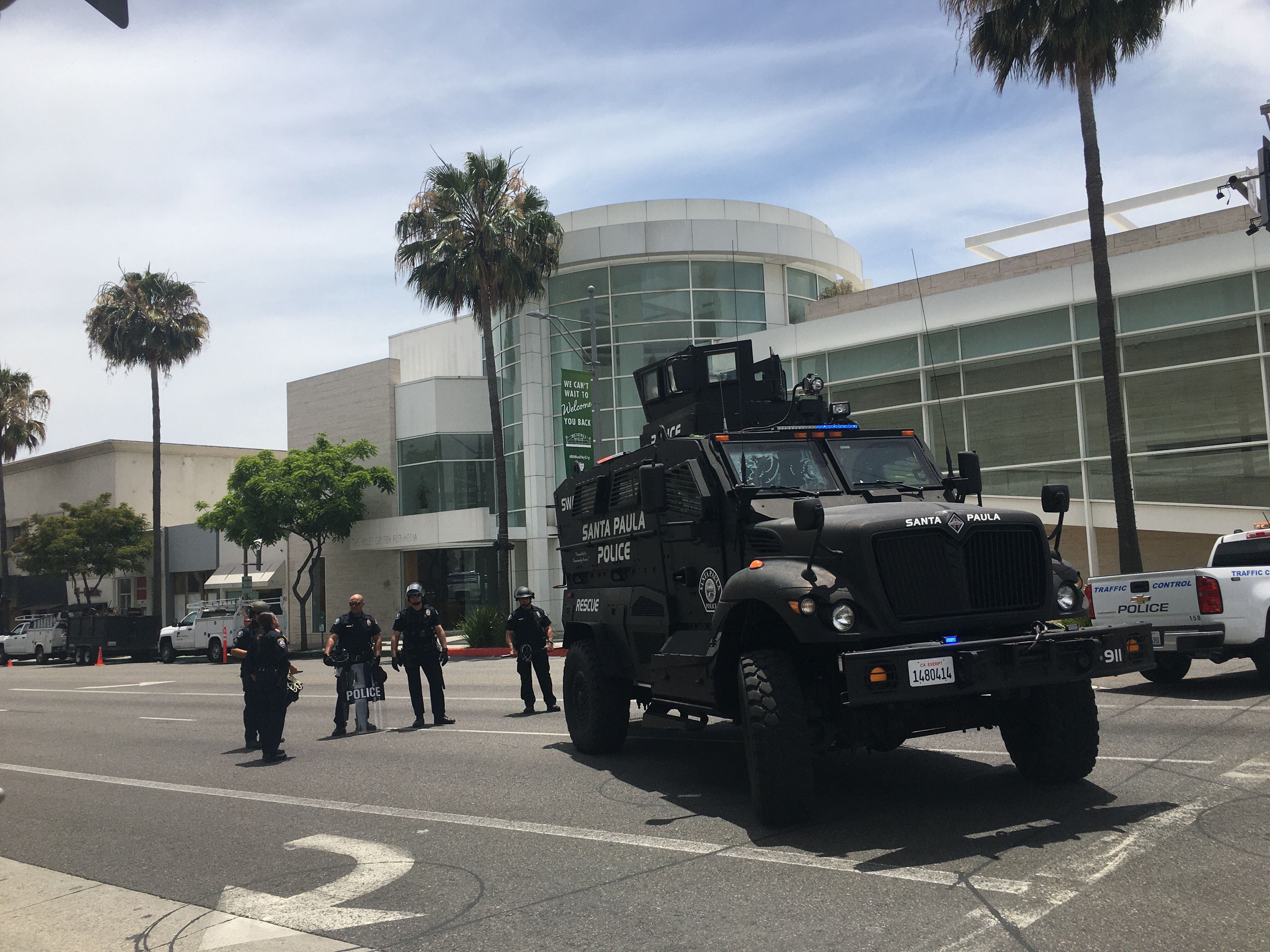 Shortly after 1 p.m., the streets in Beverly Hills were largely empty. Armored vehicles were used to block the street at Beverly Drive and Santa Monica Boulevard.
