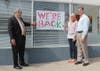 Lloyd Bookman and Don Burris of the Friends of the Brentwood Art Center were esctatic on Wednesday to see the school bustling inside, while a sign hung outside stating 'We're Back.' Don's wife Patti has taught at the school since it opened, and Lloyd's wife Beth has also been involved with the school for many years.