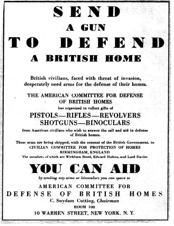 Expecting a German landing within weeks, the British government has ads placed in American newspapers, begging Americans to send Britons "pistols, rifles, revolvers and shotguns." "British civilians, faced with the threat of invasion, desperately need arms for the defense of their homes" implore the ads.