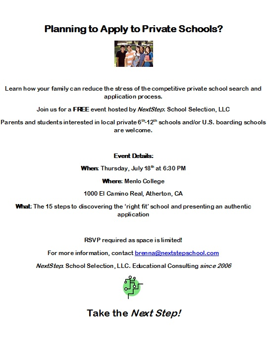 Families interested in private schools—Learn how your family can reduce the stress of the competitive private school search and application process. Join us for a FREE event hosted by NextStep: School Selection, LLC. Event Details: July 18th, 6:30 PM, at Menlo College (1000 El Camino Real, Atherton). RSVP is required, as space is limited. For more information, contact Brenna@nextstepschool.com. Take the NEXT STEP!