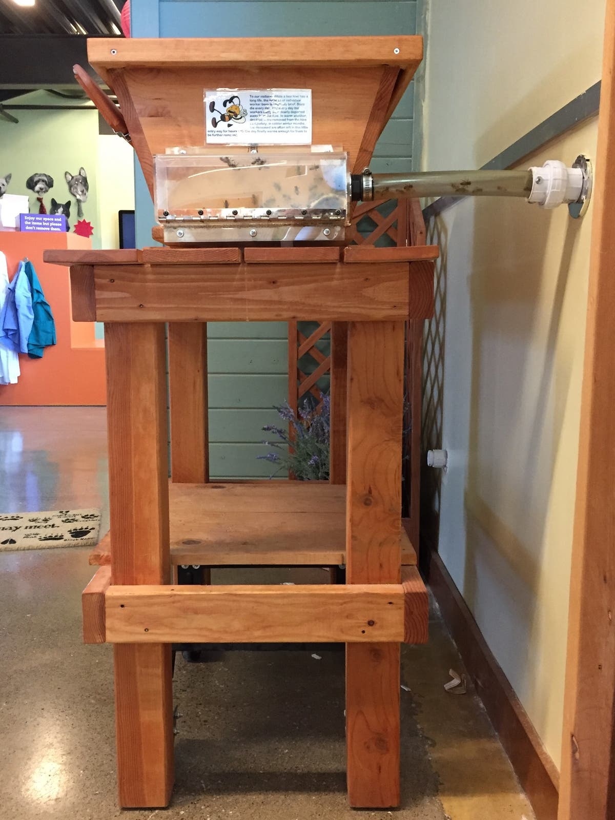 The beehive is kept on the second floor of the Burlingame shelter and is cared for by volunteer beekeeper Steve Nori. The hive box was built by Nori of pine and is constructed with a plastic tube secured to the side of the box that connects to outside of the PHS/SPCA building which serves as a tunnel for the bees to venture outside to gather nectar and pollen to bring back into the hive box.