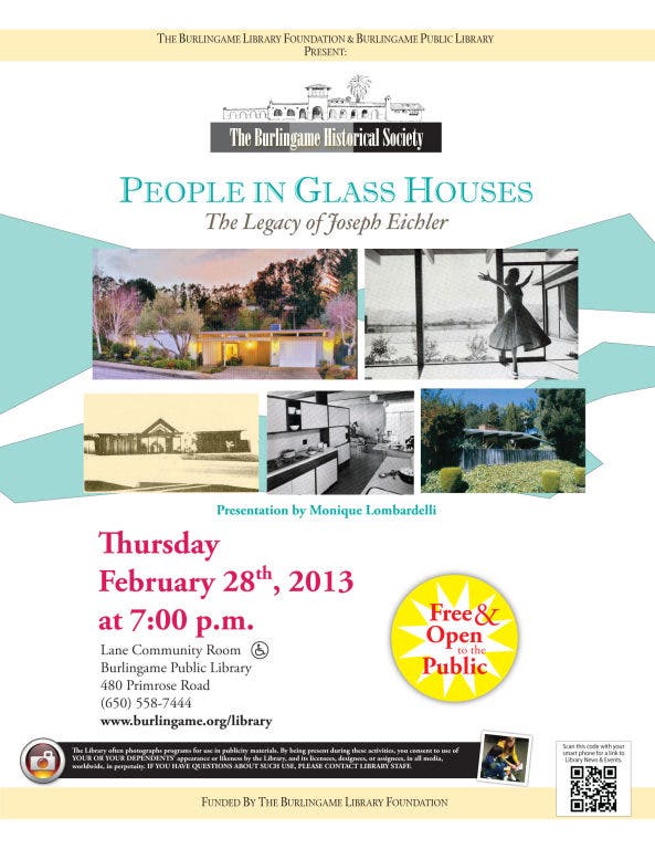 The Burlingame Historical Society and Burlingame Public Library are proud to present the film, "People In Glass Houses: The Legacy of Joseph Eichler."