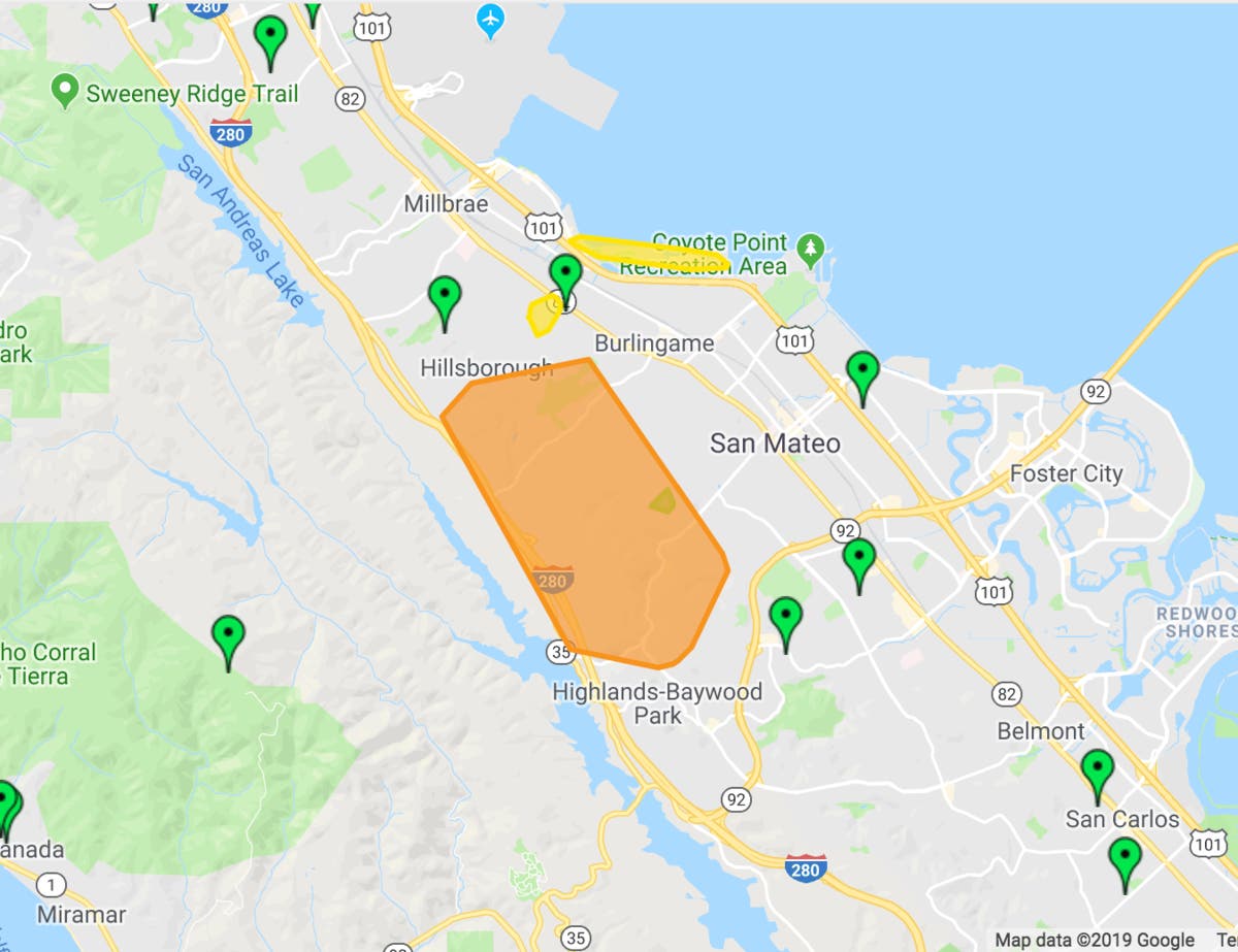 Then, at 5:03 p.m., 8,300 customers lost power in the Burlingame and Hillsborough areas. A map of that outage is below. As of 7:50 p.m., those customers remained in the dark, according to PG&E.
