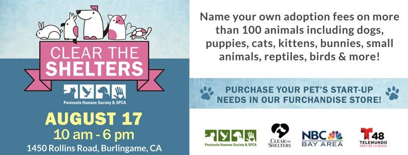 The Peninsula Humane's Clear The Shelters event runs from 10 a.m. to 6 p.m. at the site at 1450 Rollins Road in Burlingame.