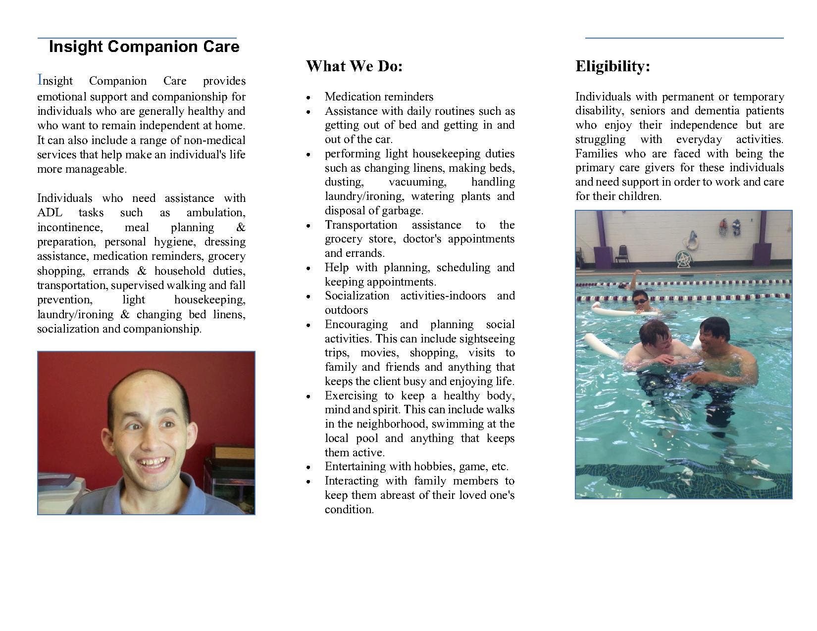 Life Steps Foundation, Inc. Northern California Adult Services. is proud to announce the new companion care program. Insight Companion Care provides emotional support and companionship for individuals who are generally healthy and who want to remain independent at home. It can also include a range of non-medical services that help make an individual's life more manageable.