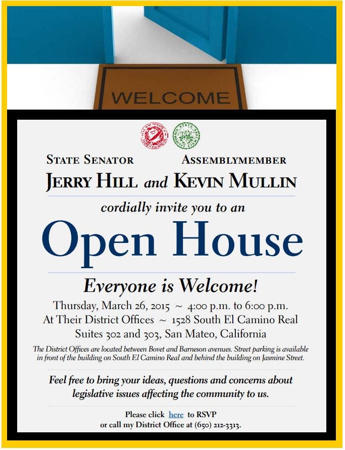 To RSVP, call Senator Hill’s District Office at 650-212-3313 or Assemblyman Mullin’s District Office at 650-349-2200, or RSVP online at :http://senate.ca.gov/2958/OpenHouse2015
