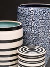 Eileen Goldenberg was 5 years old when she first touched clay and immediately fell in love. “Clay is a very immediate and plastic medium that allows me to fully express my feelings and emotions. The clay absorbs and then reflects what is going on for me,” she says. “Ceramics allows me to see how I am feeling. By combining texture, applied bumps, cut out windows and the graphic quality of sgraffito, I can turn ideas into forms that are a direct link to my inner landscape.” Sgraffito is a technique of carving through a black slip or glaze, revealing the clay underneath. Eileen uses either a very small loop tool that results in a very fine line, or a larger tool that gives bold, wide lines. Since she is hand-throwing porcelain, the lines appear white giving the appearance of drawing on clay.