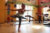She intersperses more core work with asana. She directs students into chaturanga dandasana, more commonly known as plank position, following it with the surya namaskara sun salutations of Hatha yoga.