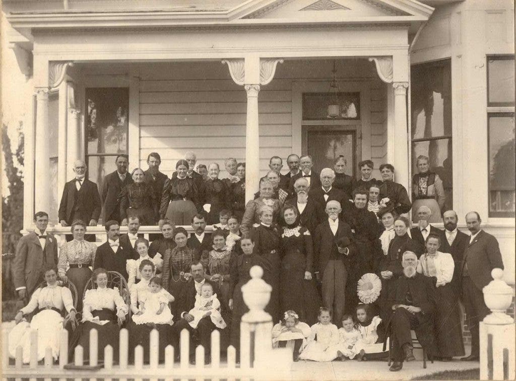 Pictured on the porch are family members including Mr. Cook, Aunt Polly Swope, Ben Campbell and Mary Campbell (in front of B.C.). In the third row, William Swope, Cousin May Cook, and Swope.