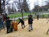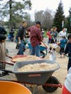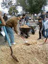 With shovels, wheelbarrows and rakes, the Fibar was moved from giant mountains in the parking lot and spread underneath swings, slides and monkey bars making a fall from the equipment much safer.