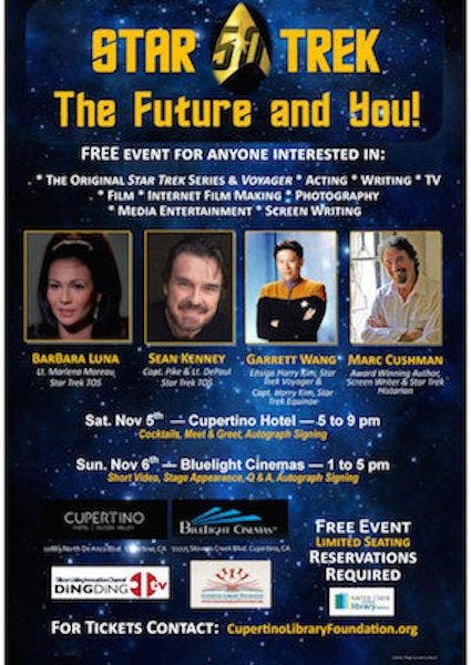Fans of the iconic TV show “Star Trek” are invited to an out-of-this-world opportunity to mark the show’s 50th anniversary at a two-day special event in Cupertino this fall. Two members of the original cast, BarBara Luna and Sean Kenney, and one member of the successful “Star Trek: Voyager” spin-off, Garrett Wang, will take part in “Star Trek – The Future & You,” starting with a meet-and-greet on Saturday, Nov. 5, followed by a special presentation on Sunday, Nov. 6. The events are free to the community with advance registration, thanks to the cooperation between The Cupertino Library Foundation, Bluelight Cinemas, the Cupertino Hotel, and Ding Ding TV.