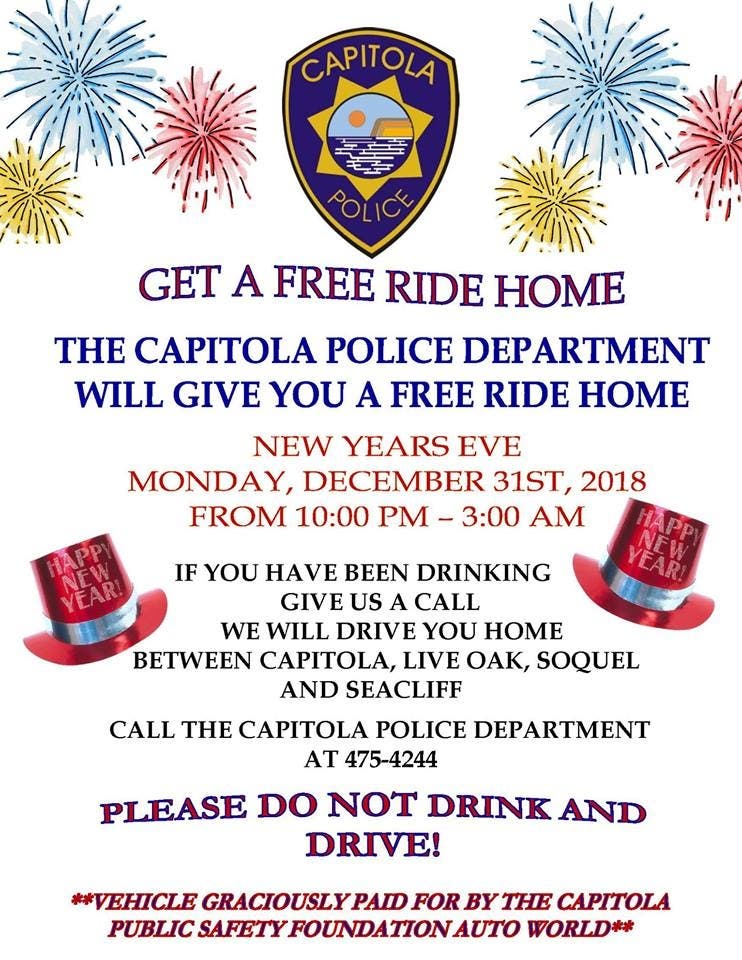 For residents who live in the areas of Live Oak, Capitola, Soquel and Seacliff, rides are available from 10 p.m. Monday, Dec. 31 to 3 a.m. Tuesday, Jan. 1 by calling the department at (831) 475-4244, police said.