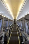 The jet has a white fuselage with a light-blue, dark-blue wave pattern on the tail. The assigned seats and no middle seats.