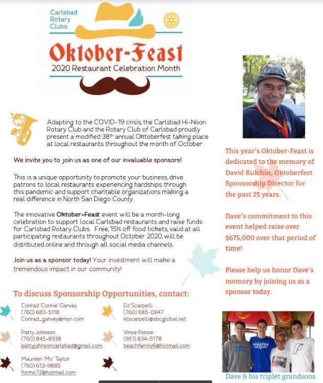Proceeds raised from past Oktoberfests were shared by the Rotary groups to fund Carlsbad charities and community projects. Restaurants and businesses interested in sponsoring or participating in the Oktober-Feast are encouraged to contact rotary officials.