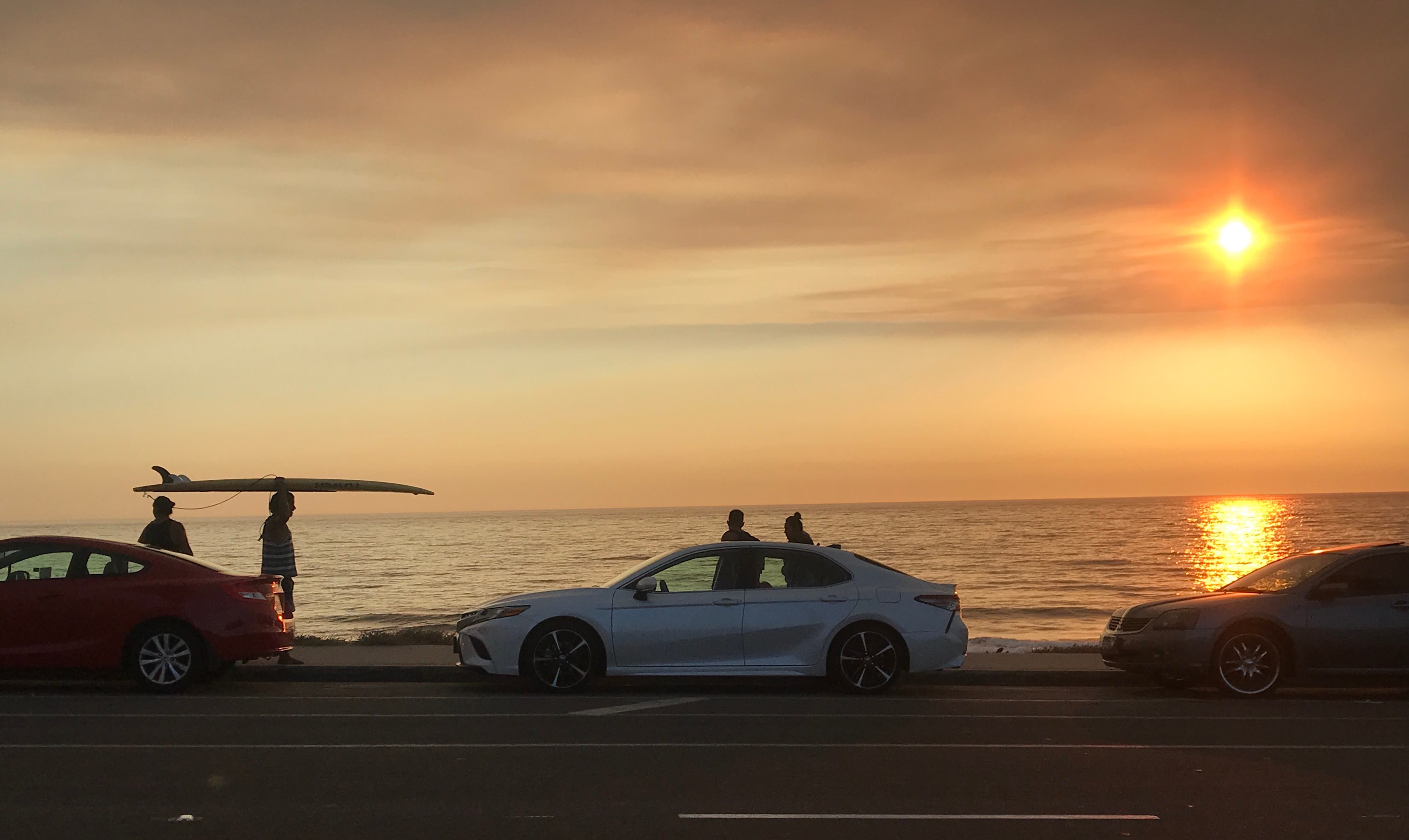 "To add to the color, the Valley Fire had just started to send smoke our way that day making for an interesting orange glow," he explained. "With the cars, surfer and ocean, it encompasses what we all love about California."