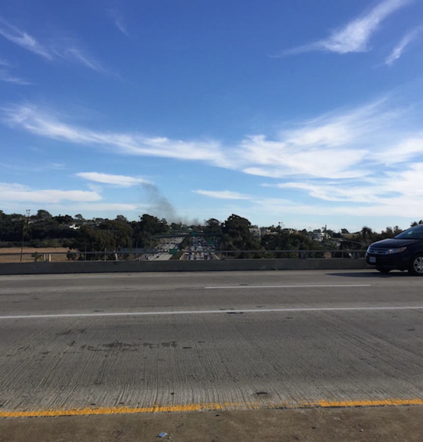 Photo: Smoke from the car fire as seen from State Route 78 over Interstate 5. Photo by via Maggie Avants/Patch