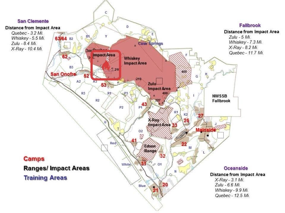 The blaze, called the Canyon Fire, sparked due to live fire training around 1:30 p.m. Monday in the Whiskey Impact Area of Camp Pendleton, which is toward the northern end of the military base, according to base officials.