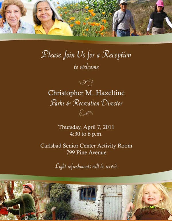 The public is invited to a reception at the Carlsbad Senior Center to meet the new Parks & Recreation Director Christopher Hazeltine. Light refreshments will be served.