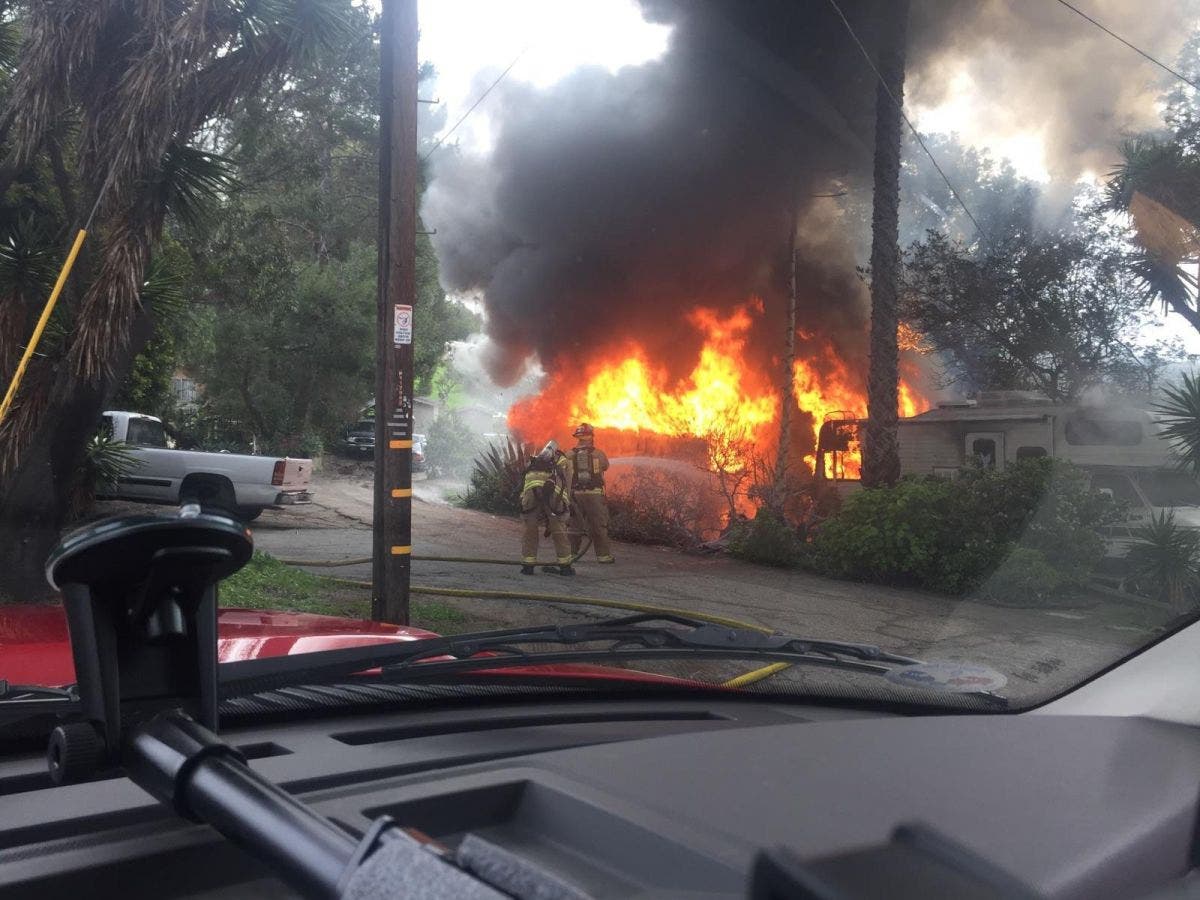 The home and a nearby recreational vehicle were briefly threatened by the blaze, but 22 firefighters from Vista, Carlsbad and San Marcos ultimately kept it from spreading.