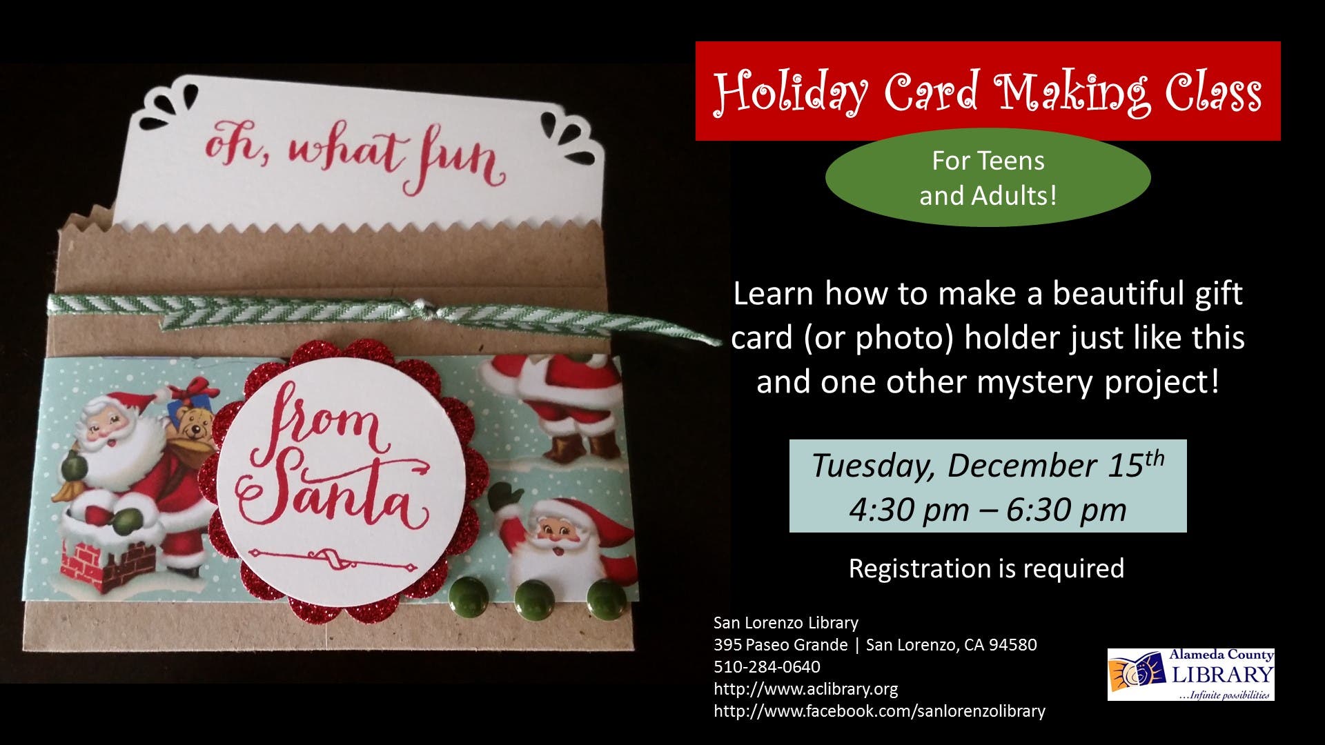 Adults and Teens are invited to register for this FREE holiday card making class at the San Lorenzo Library.
