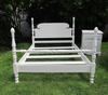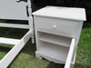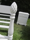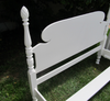 This is a super sweet full size antique bed frame that has been freshly painted to match Benjamin Moore Cloudy Grey 2107 color. Although the color is Cloudy Grey the color is actually a creamy off white. This has been professionally spray painted with lacquer and has a satin finish. The four finials are especially nice. The bed is approximately 1930-1940 but the bedside table is pine wood base so more current. As are the slats that sit inside the bed itself. These two pieces complement each other and would make a sweet set for a little girls room or guest room. It would look great in Restoration Hardware bedding like shown in last photo.