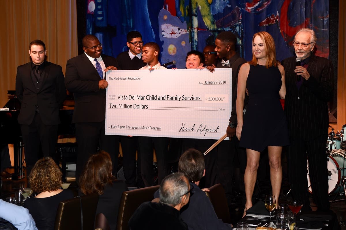 On Sunday January 7, 2018 at his Vibrato Grill Jazz Club, legendary Grammy award-winning musician, recording industry executive, and philanthropist Herb Alpert and his wife Lani, donated $2 million to establish The Eden Alpert Therapeutic Music Program at Vista Del Mar Child and Family Services in Los Angeles, California in honor of Herb’s daughter Eden. Vista Chair, Laurie Konheim received the foundation's check, expressing profound gratitude.