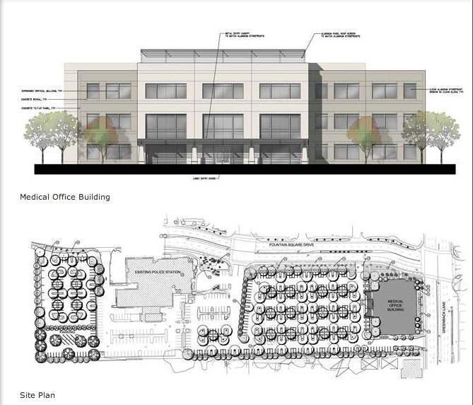 The revised project still includes the medical office building located in the same general vicinity, near the corner of Fountain Square Drive and Greenback Lane. Similar to the earlier version of the site plan, a new parking lot would still be built to the north of the police services building.