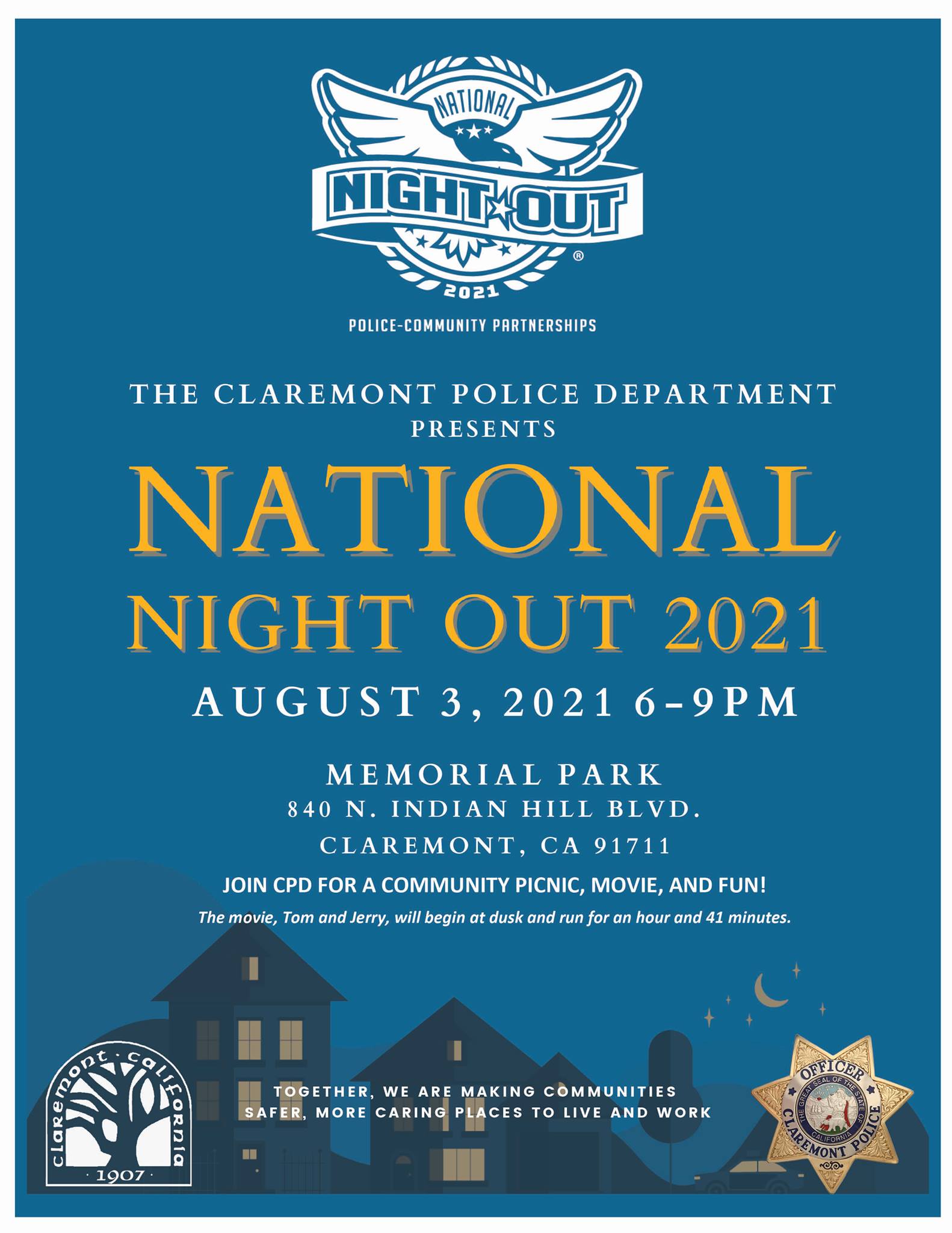 CLAREMONT, CA — Claremont's National Night Out, the annual evening marked nationwide to promote police-first responder partnerships and neighborhood camaraderie, is today — Tuesday, Aug. 3 — from 6 p.m. to 9 p.m. at Memorial Park.