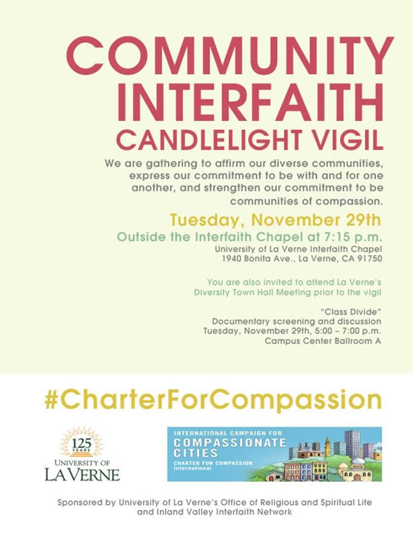 LA VERNE, CA — The University of La Verne's Office of Religious and Spiritual Life, along with the Inland Valley Interfaith Network have planned a candlelight vigil Tuesday evening, calling for unity and solidarity for all.