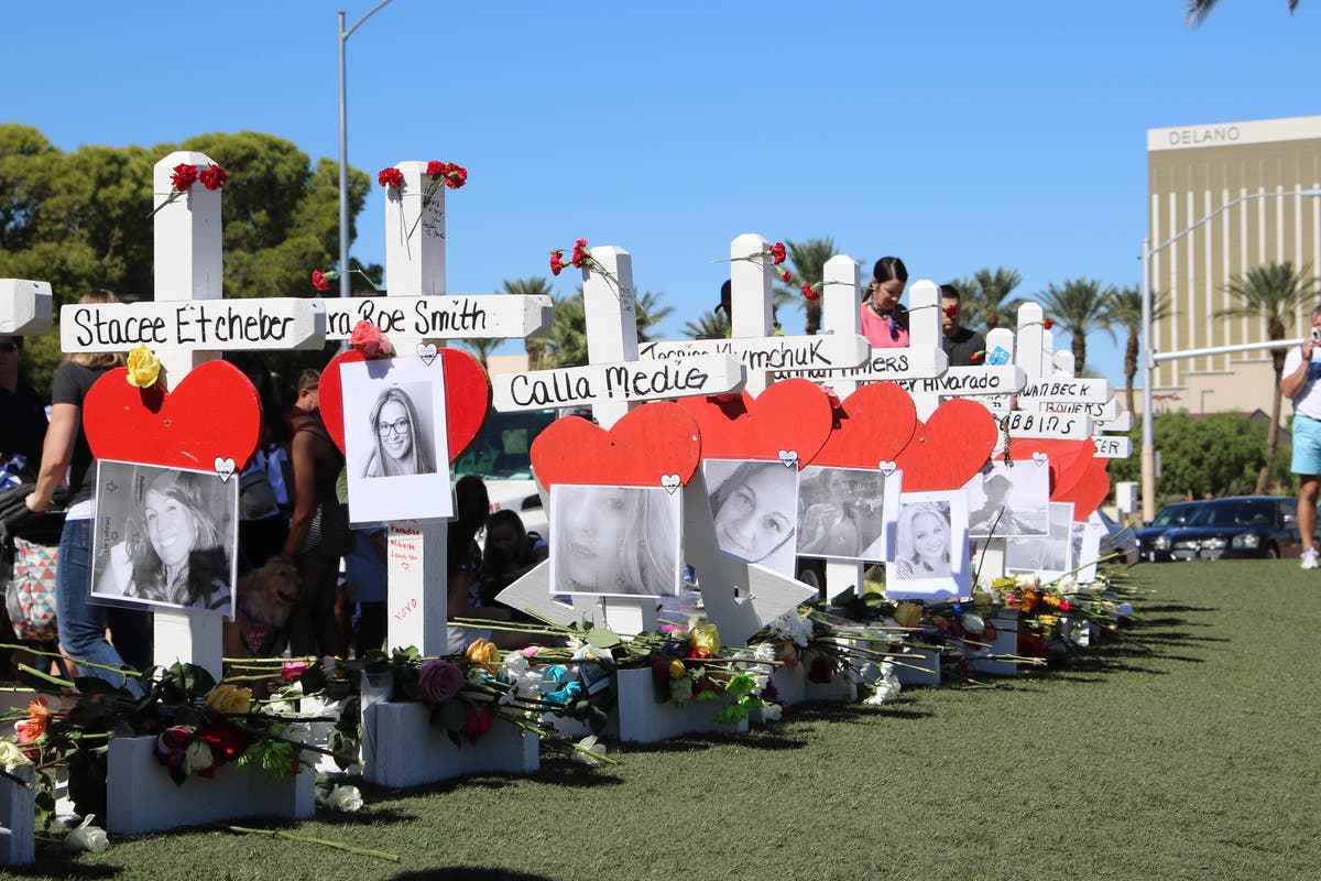 City News Service; Photo by: gotpap/STAR MAX/IPx 2017 10/6/17 Memorials and tributes in the aftermath of the mass shooting on the Las Vegas Strip (Las Vegas Boulevard) in Las Vegas, Nevada on Sunday, October 1st, 2017. In the attack that was carried out by lone gunman, Stephen Craig Paddock, 64, of Mesquite, Nevada, at least 58 people were killed and more than 500 people were injured in what is now the single largest mass shooting in United States History. From the 32nd floor of The Mandalay Bay Hotel and Casino, Stephen Craig Paddock fired long range automatic weapons at the 23,000 concert-goers below as they attended the Route 91 Harvest Country Music Festival. After the rampage - that lasted approximately 15 minutes by most accounts - Paddock apparently took his own life via a self-inflicted gunshot as police swarmed his hotel room. (Las Vegas, Nevada, USA)