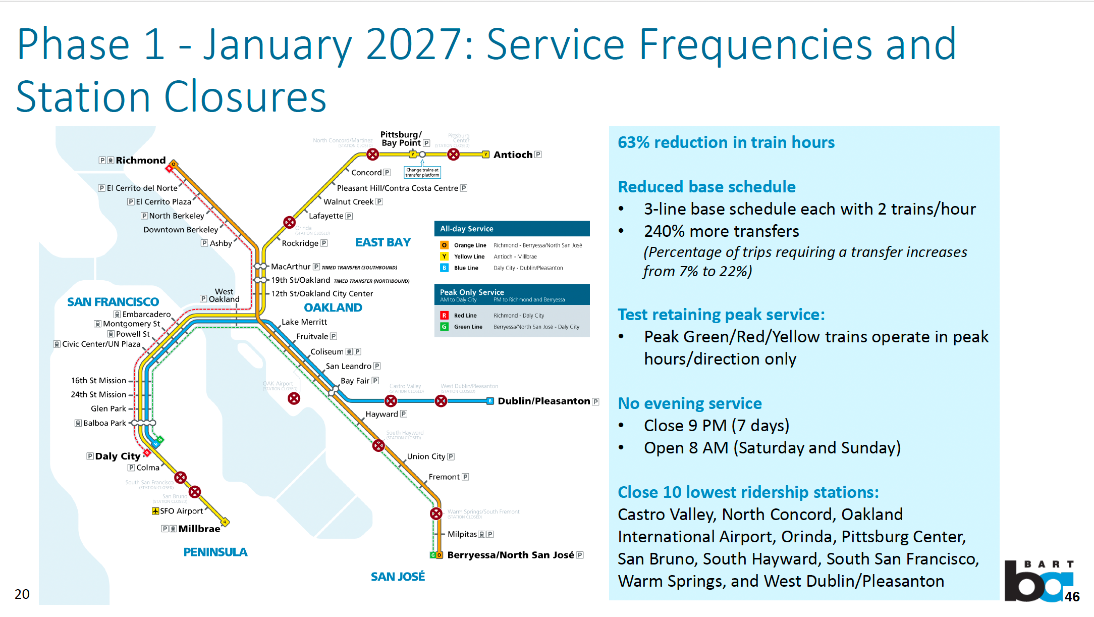 BART faces a projected $376 million budget deficit, prompting earlier proposals for sweeping reductions. Proposed "Phase 1" cuts in January 27 included slashing train hours by more than half, ending night service, and closing 10 stations including North Concord, Orinda, Oakland International Airport, and West Dublin/Pleasanton. Fares would increase by at least 30 percent, maintenance would be cut, and policing and support services would be reduced.